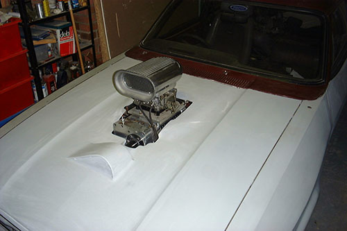I transferred the card template to the real bonnet. Here's the new bonnet cut and primed with a new fabricated 'bulge' to cover the belt and pulley.