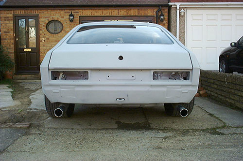 For the first time, the car is all in primer, so I rolled it out of the garage to take a complete series of photographs all the way around it.