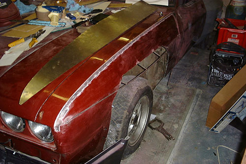 The top of the arch was filled in with a piece to bridge below the quarterlight and the new wing. Card was used to protect the glass while welding.